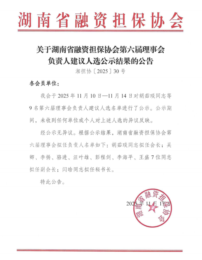 关于湖南省融资担保协会第六届理事会负责人建议人选公示结果的公告