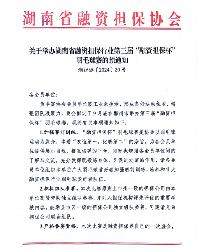关于举办湖南省融资担保行业第三届“融资担保杯”羽毛球赛的预通知