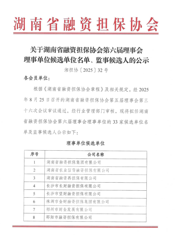 关于湖南省融资担保协会第六届理事会理事单位候选单位名单、监事候选人的公示